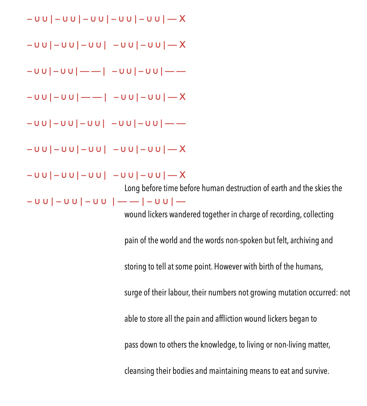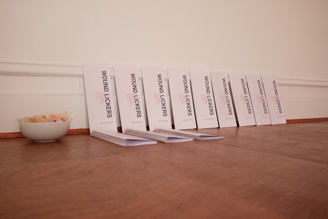 By the 16th century it came to be used in Europe as a designation not only for epic poems, but also other literary forms, such as collections of miscellaneous writings and, later, any extravagant expression of sentiment or feeling. Just as in music it can be regarded as a one-movement work that is episodic yet integrated, free-flowing in structure, featuring a range of highly contrasted moods, colour and tonality. An air of spontaneous inspiration and a sense of improvisation make it freer in form than a set of variations. The work gathers itself around the terminology of the rhapsody. It consists of three parts that loosely combine science fiction, feminist theory and anthropology to imagine a setting of interlinked cosmologies, myth and histories. Through these three forms the characters of the Woundlickers, mythological beings, collectors of pain and trauma, but also translators and distributors of oral history especially of silenced accounts are introduced.